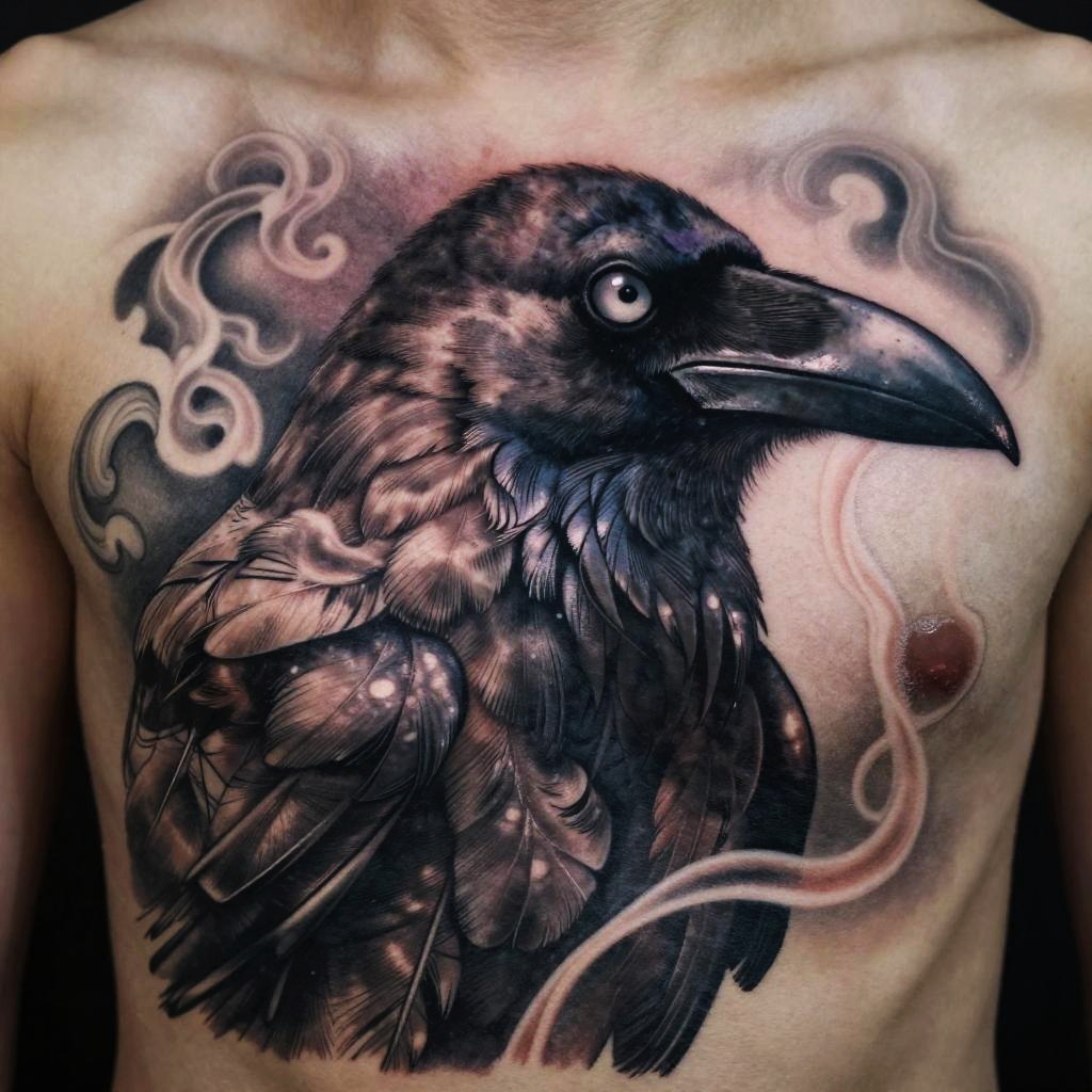 Realistic Crow Tattoo with Mystical Smoke