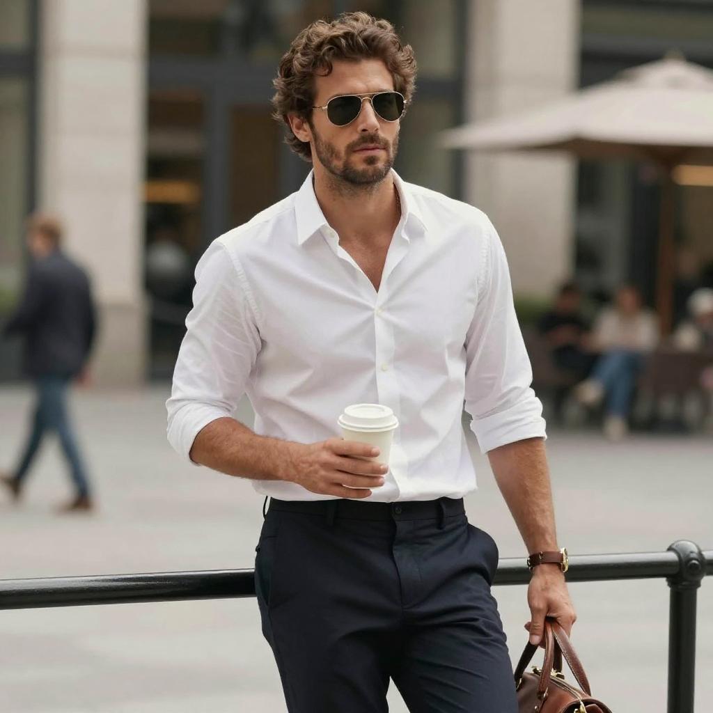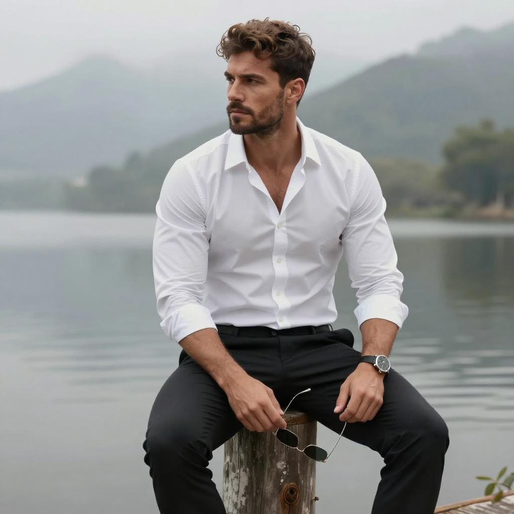 Photograph of a handsome, muscular man with short, curly brown hair and a trimmed beard. He's wearing a white, slightly unbuttoned dress shirt and black pants, holding a pair of sunglasses in his right hand. He's sitting on a weathered wooden post by a calm, misty lake with hazy mountains in the background. He looks off to the side with a thoughtful expression.