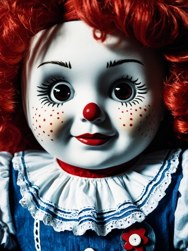 Raggedy Ann Costume Woman, a close up of a doll with red hair and a blue dress
