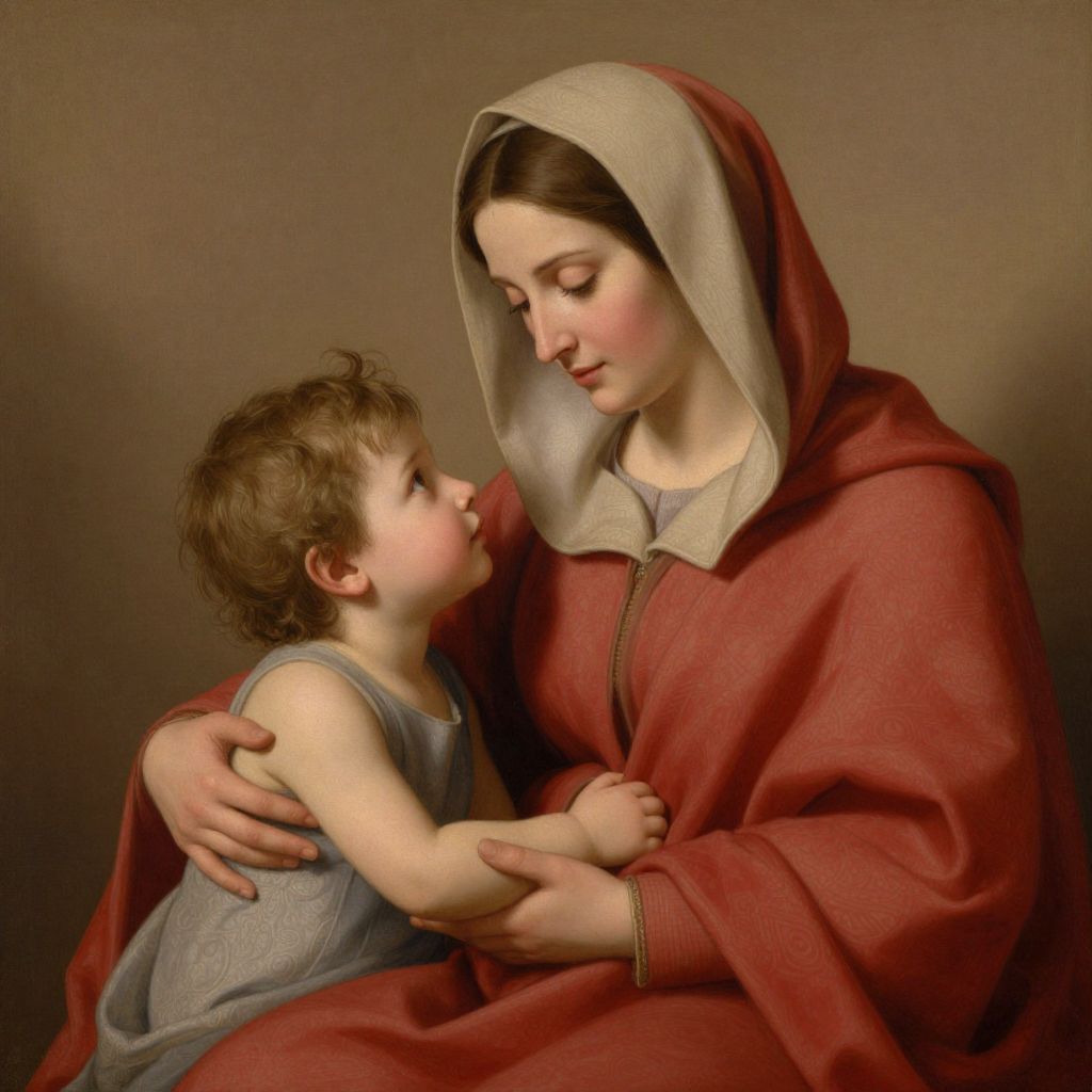 A tender digital artwork depicting a serene moment between a young child and a woman draped in a flowing red robe and beige hood, rendered with soft, warm lighting and high-definition detail reminiscent of classical religious iconography.