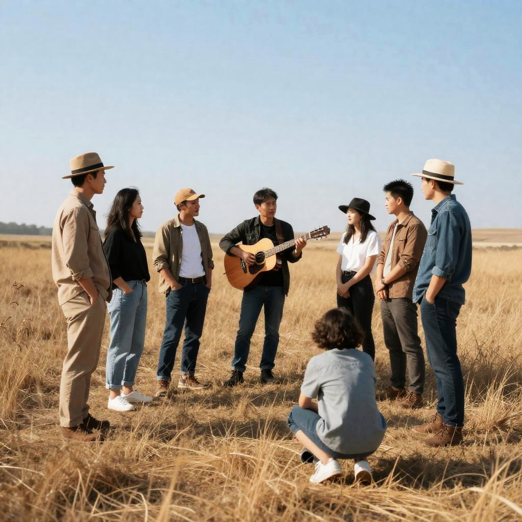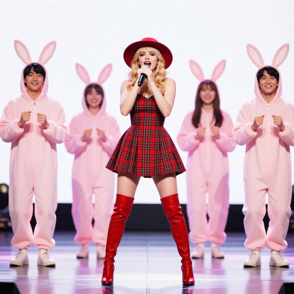 Photograph of a group of six people performing on stage. Central figure: woman with red plaid dress, red fur coat, red hat, red boots, holding microphone, singing. Background: five men in winter clothing, red hats, and plaid patterns. Bright white background, reflective floor. Woman in foreground: confident expression. Men: various expressions, some smiling, some singing. Group: dancing, holding hands, pointing. Casual, festive attire, winter theme.