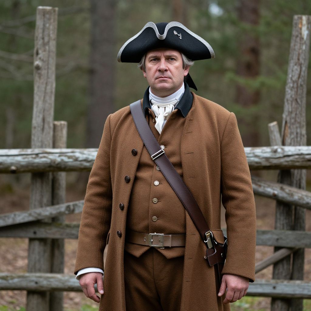 A man wearing a colonial-era costume resembling George Washington, including a brown coat, buckles, and tri-corner hat, standing in front of a rustic wooden fence in a forested area, realistic photography style.