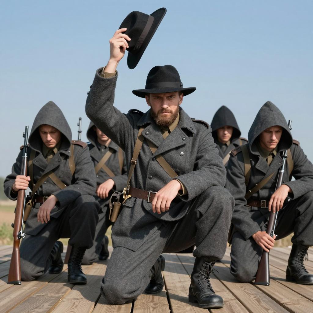 Photograph of five male soldiers in World War II uniforms, one man with a beard in a brown uniform stands to the right, holding a door open. Four soldiers with rifles and caps stand to the left, looking at the man entering. The man entering has a serious expression, bending forward slightly. Background includes a weathered building with a metal roof and stone wall.