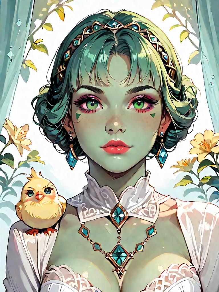 A digital illustration of a woman with long dark green hair lying on a bed. She is wearing a shiny, body-hugging emerald green bodysuit with lace trim and floral motifs. The outfit features long sleeves and a deep V-back design. The background is a soft beige bedding surface.