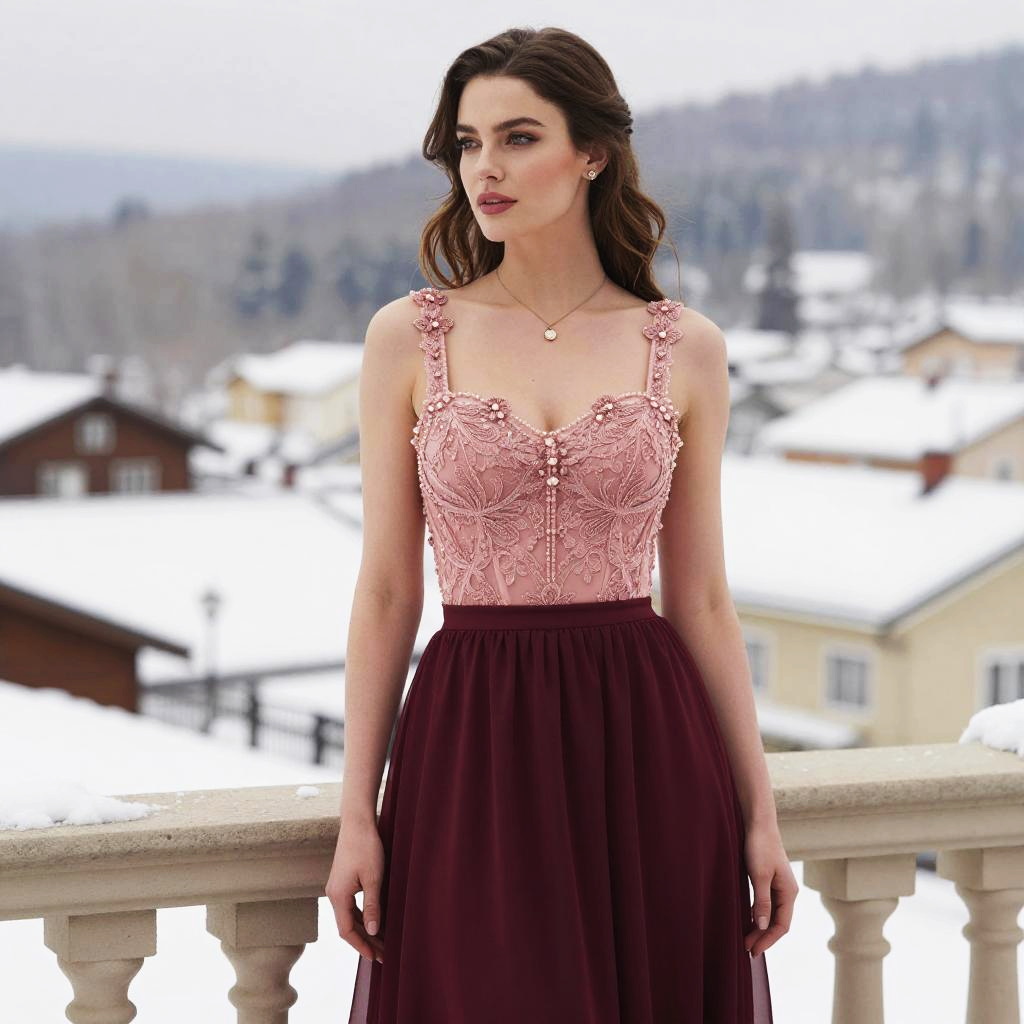 A busty woman in formal elegance, wearing a fitted bodice with intricate lace and beading in rose pink, an illusion neckline, and a burgundy chiffon A-line skirt, stands on a terrace facing a snowy landscape. She accessorizes with a subtle pendant necklace and stud earrings, her hair styled in a half-up, half-down do, all captured in the visual style of Tuttle Publishing. Sexy. Pretty face and beutiful eyes