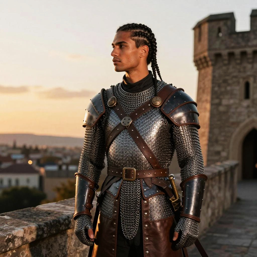 Warrior Braid hairstyle on man, wearing polished chainmail with leather cuirass, in stone castle battlements, captured in fashion editorial style with warm sunset glow.