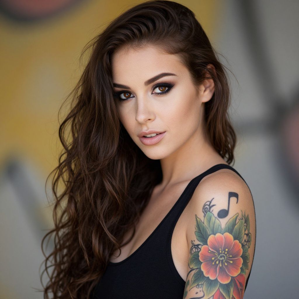 Photograph of a young woman with long, wavy brown hair and light skin, looking directly at the camera with a slight smile. She has dark eyeliner and subtle makeup, wearing a black tank top. Her right shoulder is prominently tattooed with colorful floral designs and a music note. The background is blurred, featuring yellow and gray tones.