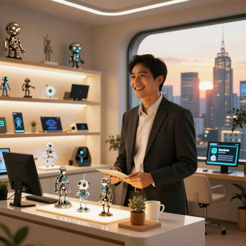 Happy merchant AI in a cozy yet advanced virtual shop, shelves stocked with glowing digital merchandise, warm ambient lighting highlighting intricate cybernetic details, friendly displays projecting personalized offers, a backdrop of a sprawling smart city skyline at sunset, futuristic but inviting environment.