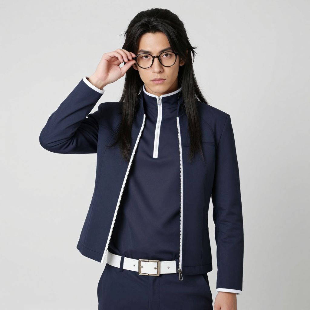Photograph of an Asian man with long, straight black hair and black-framed glasses, standing against a white background. He wears a dark navy blue, tailored suit with white zipper details, a matching shirt, and a white belt with a silver buckle. His expression is serious, and he is adjusting his glasses with his right hand. The suit has a modern, slightly futuristic look, and the white accents provide a striking contrast against the dark fabric. The overall style is sleek and sophisticated.