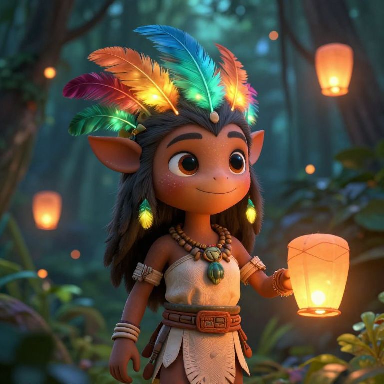 CGI image of a cute, dark-skinned, elf-like girl with colorful feather headdress, holding a glowing lantern in a magical forest.