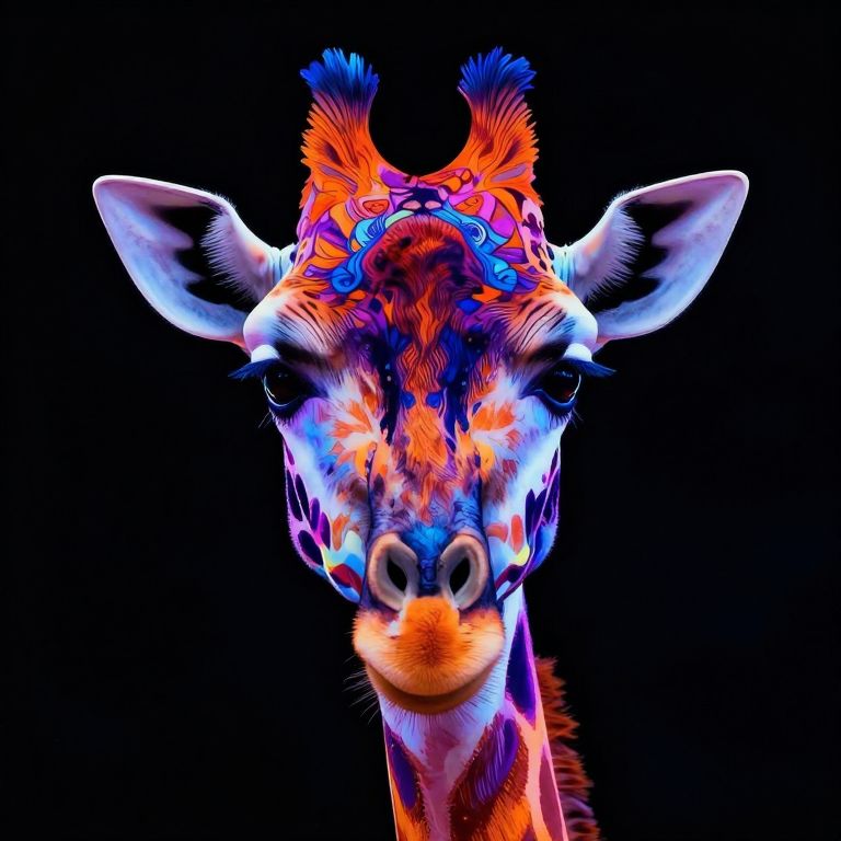 The image features a symmetrical face of a giraffe, rendered in a vibrant, neon color palette against a stark black background. The giraffe's head is adorned with intricate, stylized patterns that mimic the natural texture of its skin, creating a striking contrast with the vivid colors. The giraffe's eyes are large and expressive, gazing directly at the viewer, while its ears are perked up, adding to its alert and curious demeanor. The overall composition is balanced and harmonious, with the giraffe's head centrally positioned and the patterns on its face and neck flowing seamlessly together. The use of neon colors, such as bright blues, oranges, and purples, gives the image a dynamic and energetic feel, while the detailed patterns and textures add depth and complexity to the scene. The black background serves to highlight the giraffe's face and the vibrant colors, making it the focal point of the image.