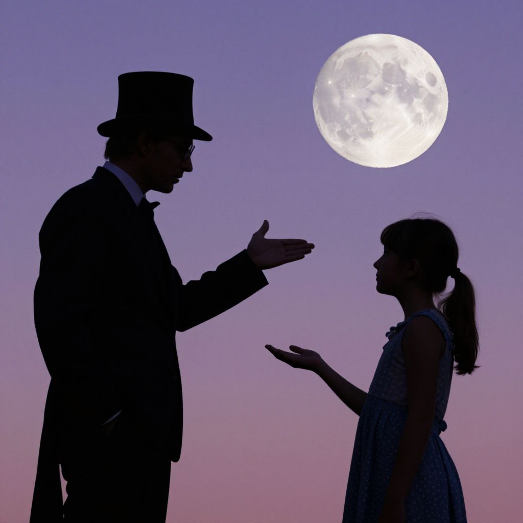 Silhouetted figures engage in a thoughtful exchange beneath a luminous full moon, as a man in a top hat and monocle gestures toward a young girl with outstretched hands, set against a gradient sky transitioning from deep purple to soft pink.