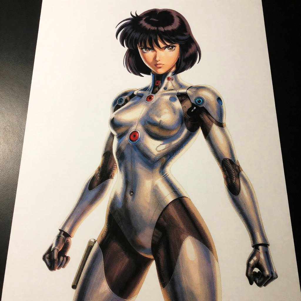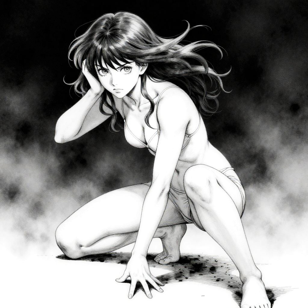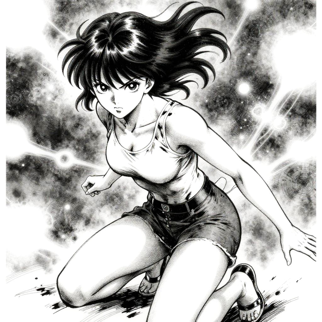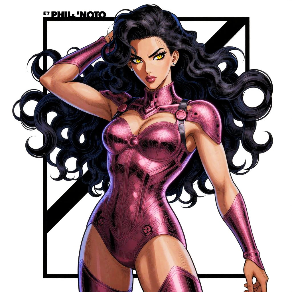 By Phil Noto and Kentaro Miura, neon outlines, painterly texture, cinematic lighting:1.4, poster art, bold lines, hyper detailed, expressive, award winning, female:1.4, intricate details, masterpiece, best quality:1.4, looking at viewer, dynamic pose, wide angle view, in the style of Hayao Miyazaki