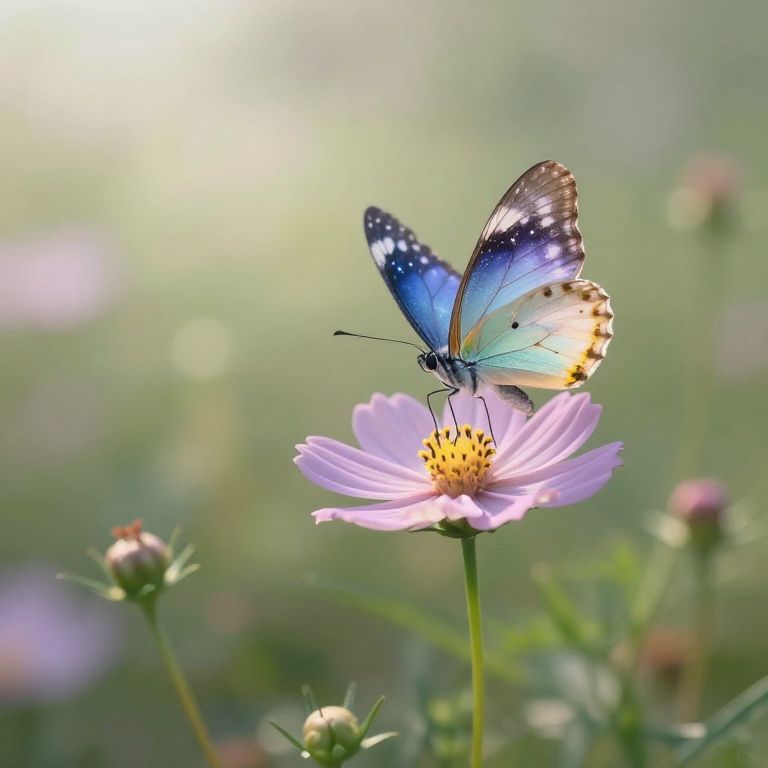 In a serene meadow where sunlight filters through an ethereal haze, a delicate butterfly with translucent wings adorned with celestial patterns hovers gracefully over a flower that seems to pulse with radiant energy, defying the ordinary boundaries of nature.