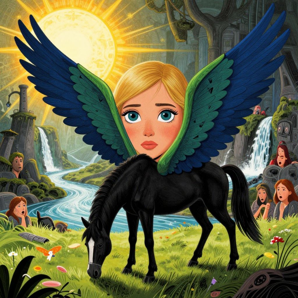 Cinematic fantasy style, sharp, illustrated movie poster, hand drawn, full color, magical fantasy world, beautiful ultra detailed book cover illustration of a detailed matte painting, Soon a dark purple griffin with an eagle's beak and a body as shiny as a panther's ran out of the forest, The griffin ran across the clearing with majestic dignity, slowly moving its powerful lion's paws, Its giant wings were spread wide - each feather a yellow-red pattern, an ornate coloring, the griffin was about to take off, graze on a beautiful meadow, bright sun, beauty, very huge wings, deffrent colors pegasi, grazing, eating grass, wings folded, deep color, fantastical, splash screen, complementary colors, fantasy concept art, 8k resolution trending on Artstation Unreal Engine 5, enchanting magical mystical divine, ultimate masterpieceDIGITAL ART, style Magali Villeneuve, the background is a river valley and waterfalls, DIGITAL ART, style Magali Villeneuve, beautiful eyes, attractive, cute, plump lips, beautiful eyes, fantasy art, fantasy art, perfect face model, dark atmosphere, bright colors, confused faces, scared, worried, hard shadows, graphite shade, stencil drawings, in a dark fantasy setting, detailed background, foreground, full length, by Sydney Edmunds and Evgeny Lushpin in the style of Georgina Goodwin and Amiet Cuno