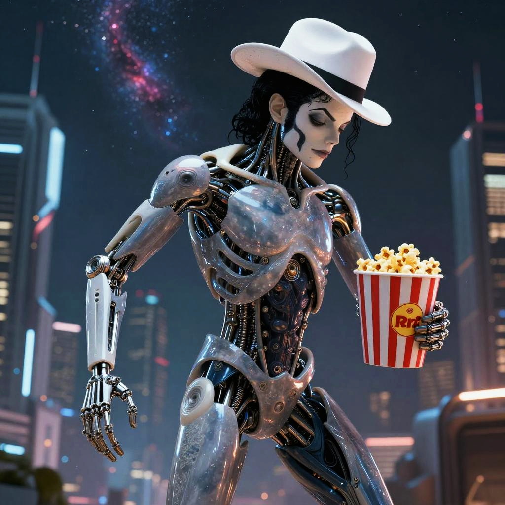 Realistic, michael jackson, biomorph, anatomical, biomechanical details, holding popcorn, In the future, Cyberpunk city, ethereal, real skin, beautiful dark theme, hyper dimensional space, crystal nebula, elegant, organic meets artificial, natural skin, (intricate details), (hyperdetailed), art by HR GIGER, cyberpunk style, dancing, Cyberpunk style, white hat