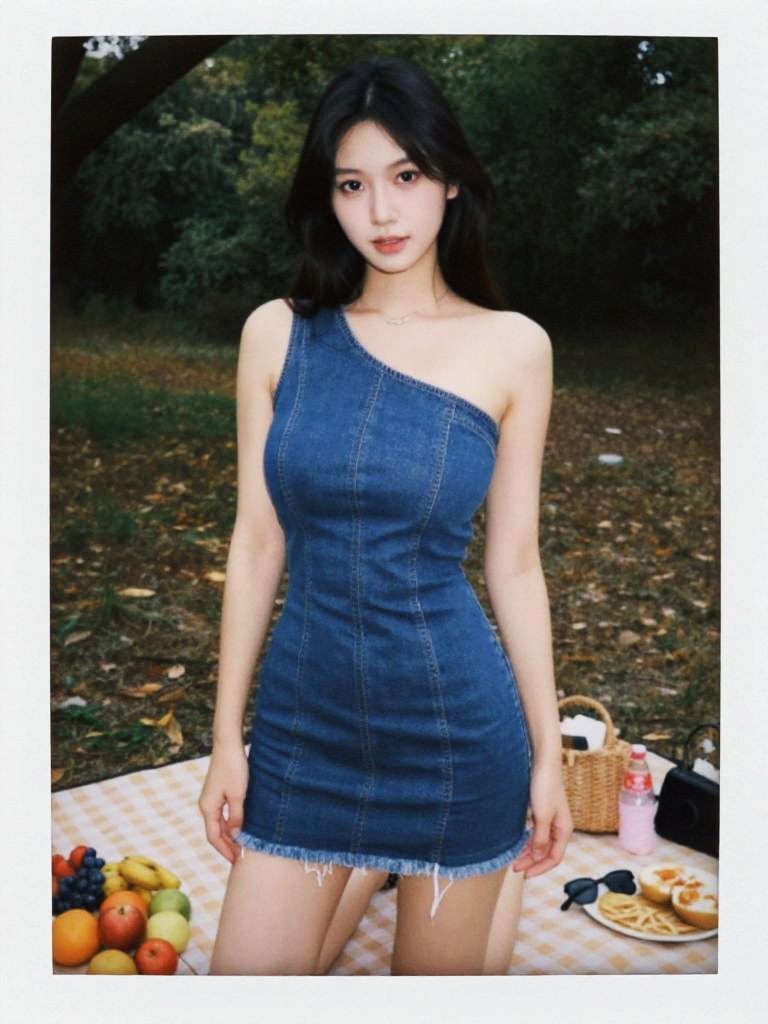 A Slim woman in a casual denim mini dress, sleeveless with a one-shoulder design, fitted silhouette, and frayed hemline, captured in the visual style of instant film, enjoying a picnic in a nature reserve. Sexy. Pretty face and beаutiful eyes. Big breasts
