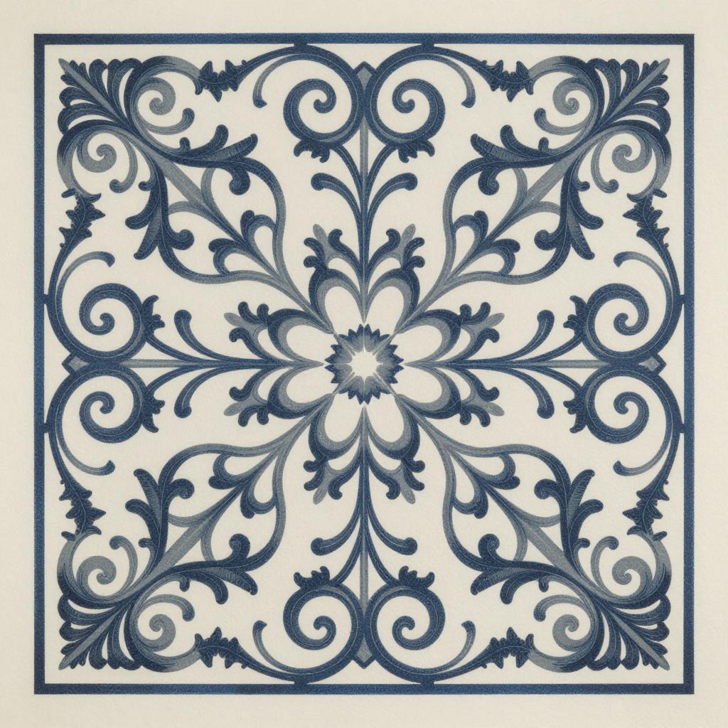 Scrollworks pattern featuring Art Nouveau flowing organic tendrils with stylized leaves in steel blue scrollwork on foggy grey arranged as radiating scrolls from the center forming a mandala-like design on ornamental picture frame border rendered as screen-printed poster style with a few solid colors, ultra-detailed, sharp ornamental design, high resolution, intricate decorative pattern art