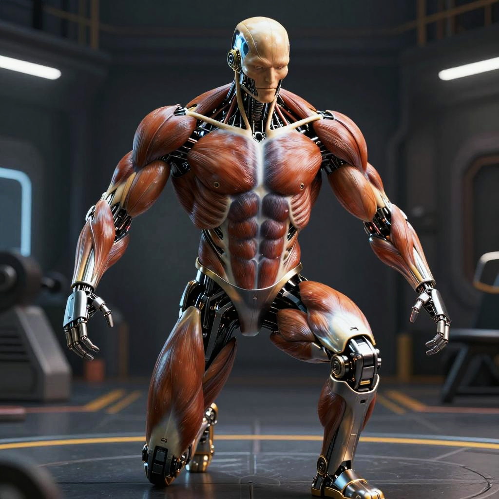 AI generated muscle composition in a robotic athlete, fusion of organic muscle textures with metallic surfaces, intense shadow contrast, neon highlights, biomechanical theme, action pose in a futuristic arena, high detail
