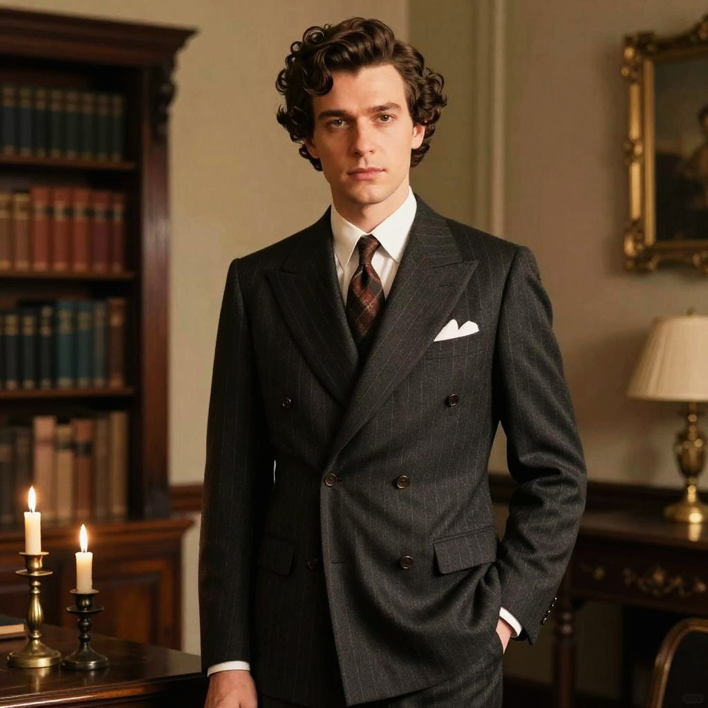 Sleek Bob hairstyle on mature man, wearing classic wool coat, in vintage library, captured in fashion editorial style with warm ambient light.