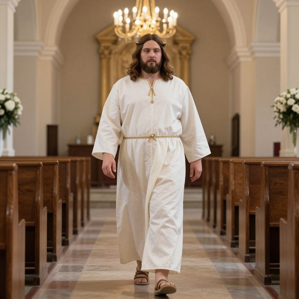Plus Size Jesus Costume, image of jesus walking in a church with a chandelier
