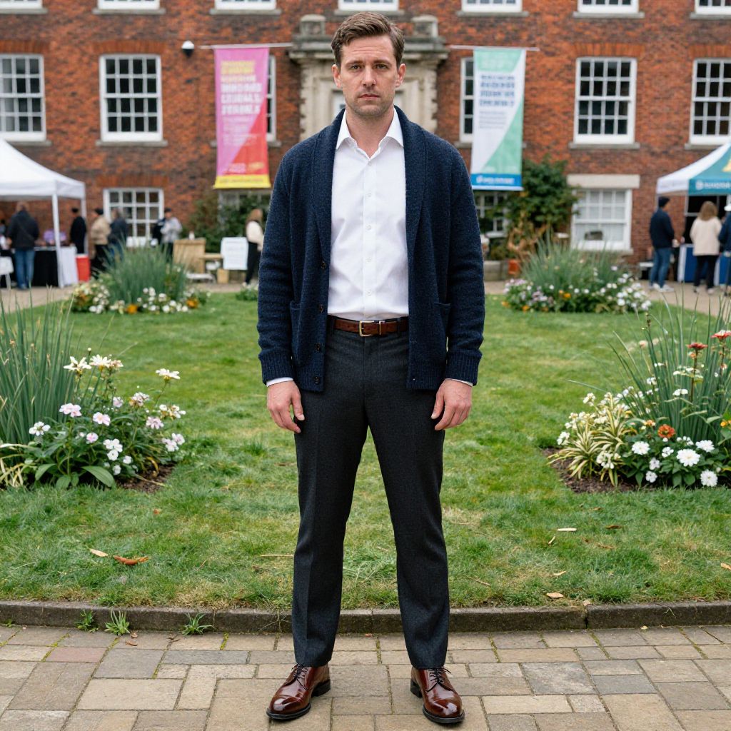 A man, white dress shirt, navy wool cardigan, tailored charcoal trousers, brown leather belt, polished oxford shoes, historic brick architecture, lush green gardens, community event banners, oversaturated film, confident expression Man has masculine face and piercing eyes