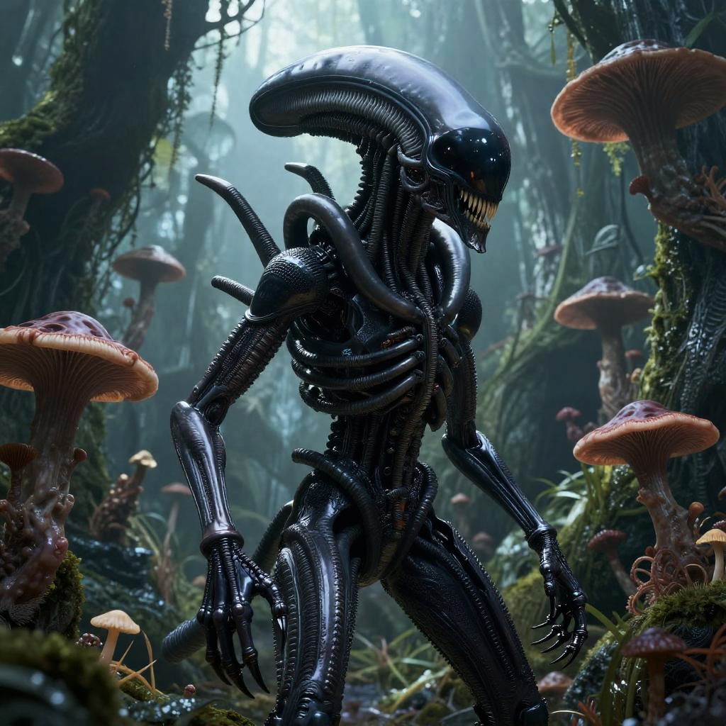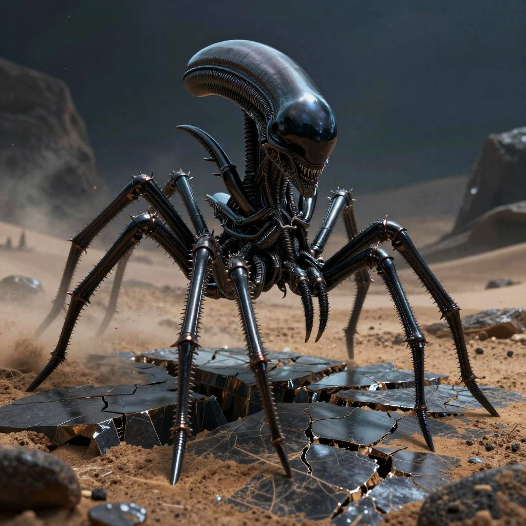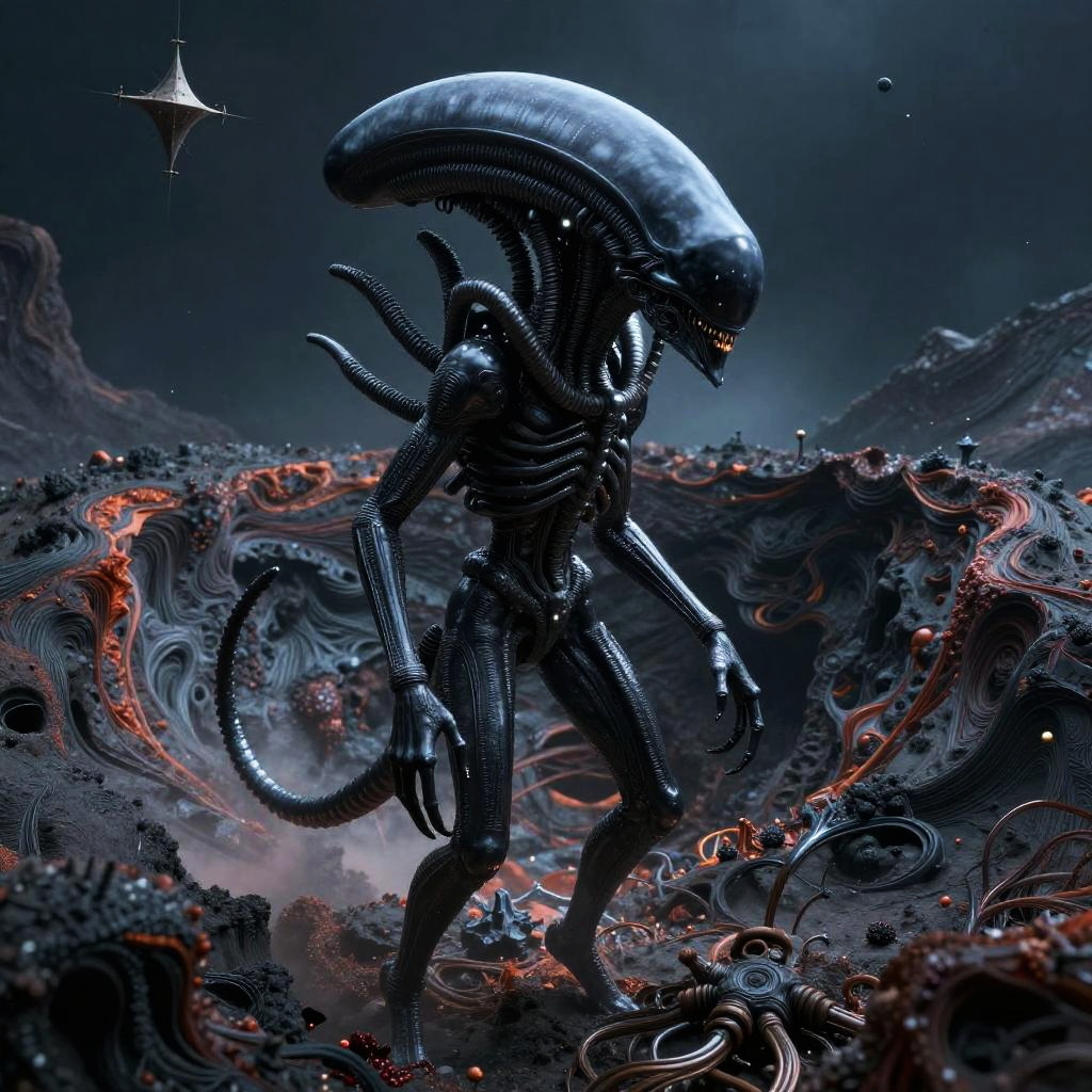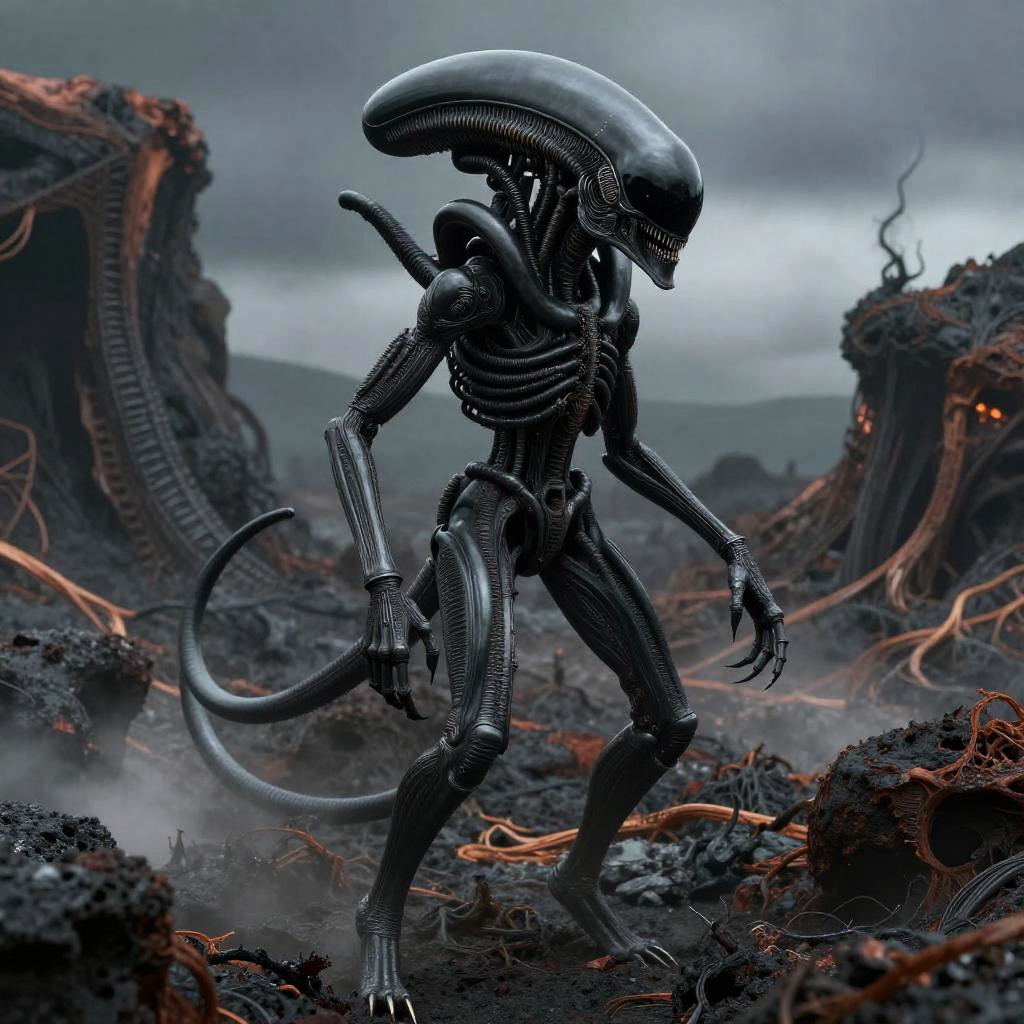 Reptilian amphibian alien xenomorph in H.R. Giger style, polished jet black, in a dried volcanic marsh, intricate armored scales with tribal motifs, eerily silent atmosphere