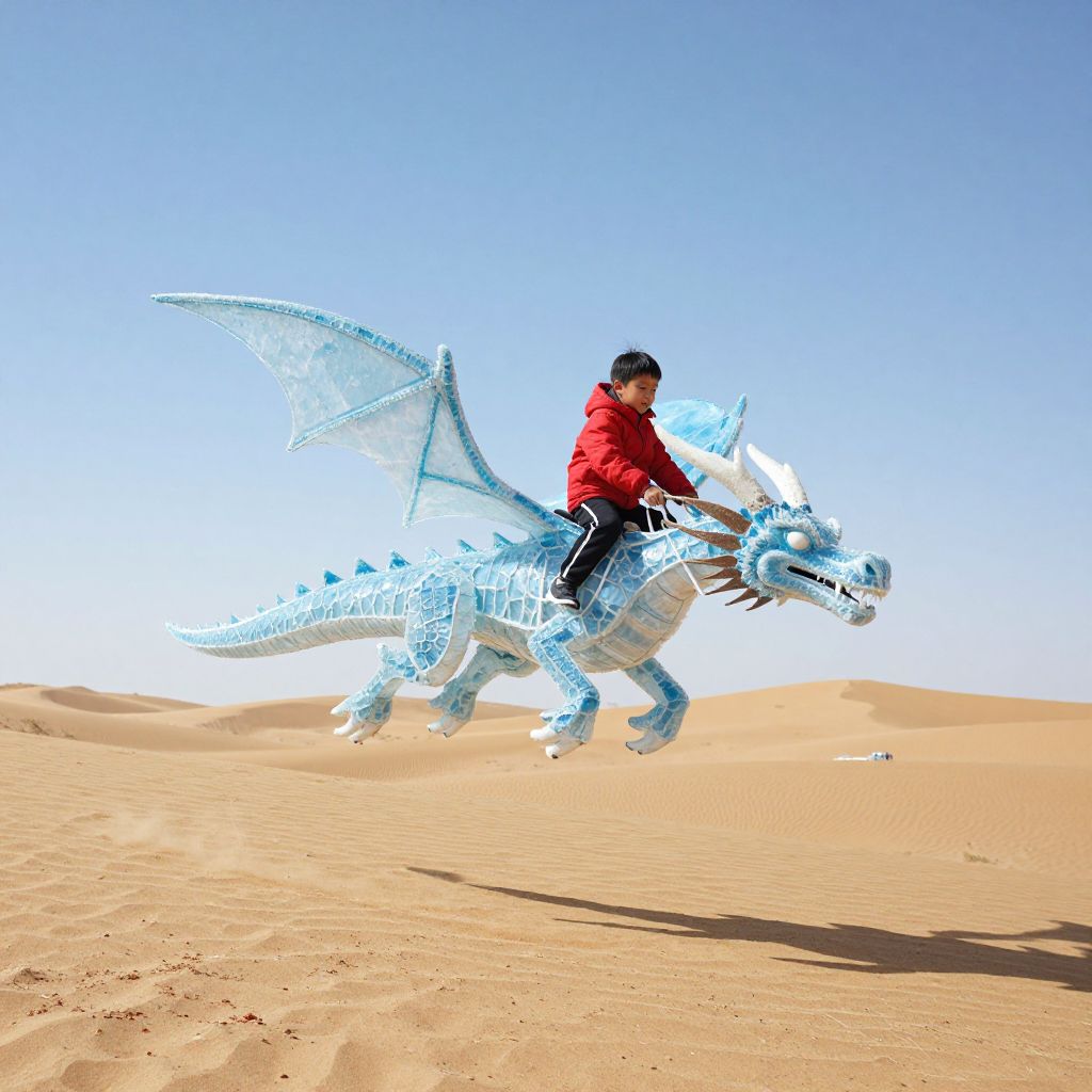 Photograph of two children flying on a large, blue, teardrop-shaped airship over a desert with a third child pointing up below, bright