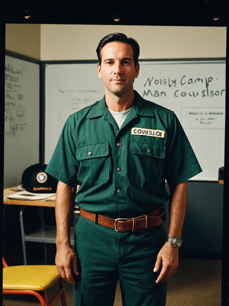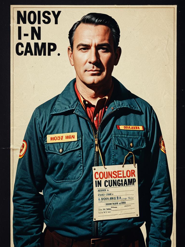 Man in Counselor Camp Poster Costume, waist-up portrait with retro poster detail