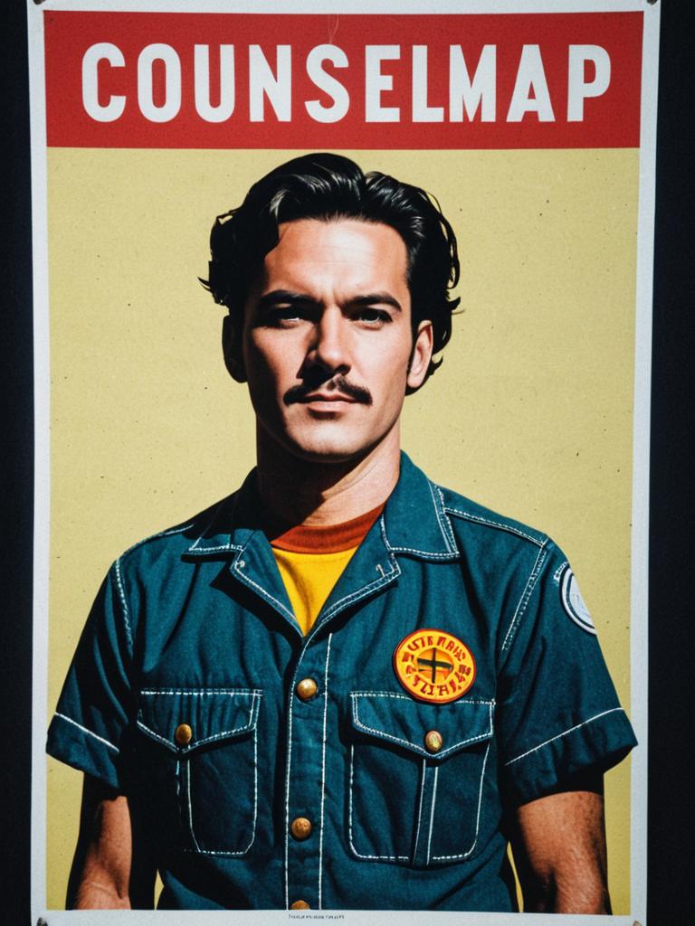Waist-up portrait of a man wearing a retro-style counselor camp uniform reminiscent of vintage camp posters. The subject has dark hair, a mustache, and wears a dark blue shirt with two chest pockets and a round yellow and red patch. The background is beige with a red banner on top that reads 'COUNSELMAP.'