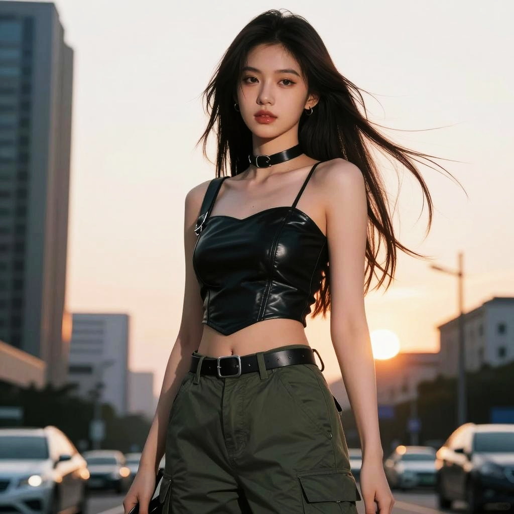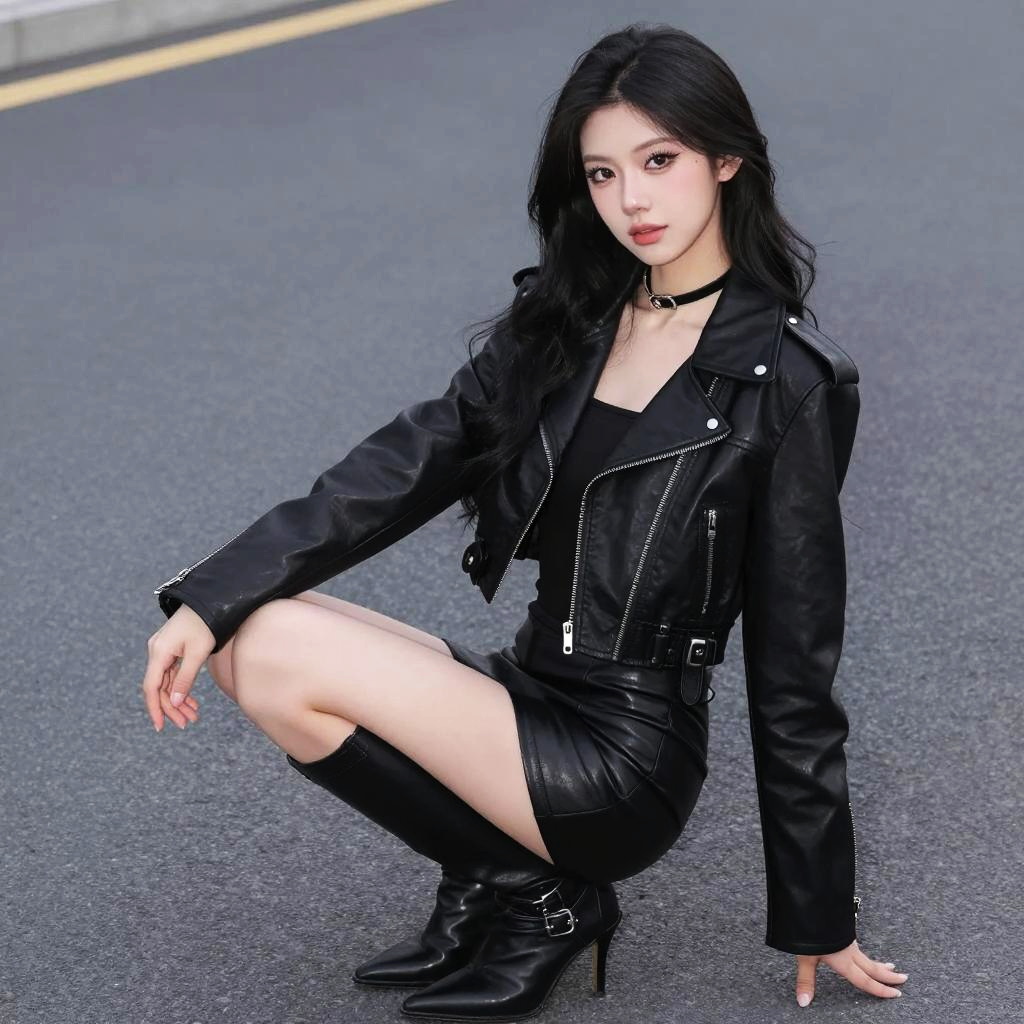 A stylish young woman with long black hair is crouching on a paved surface, dressed in a black leather jacket, a matching skirt, and high-heeled boots with buckles. Her confident pose and bold makeup create a striking, edgy look in a digital art style that blends realism with smooth, illustrative details.