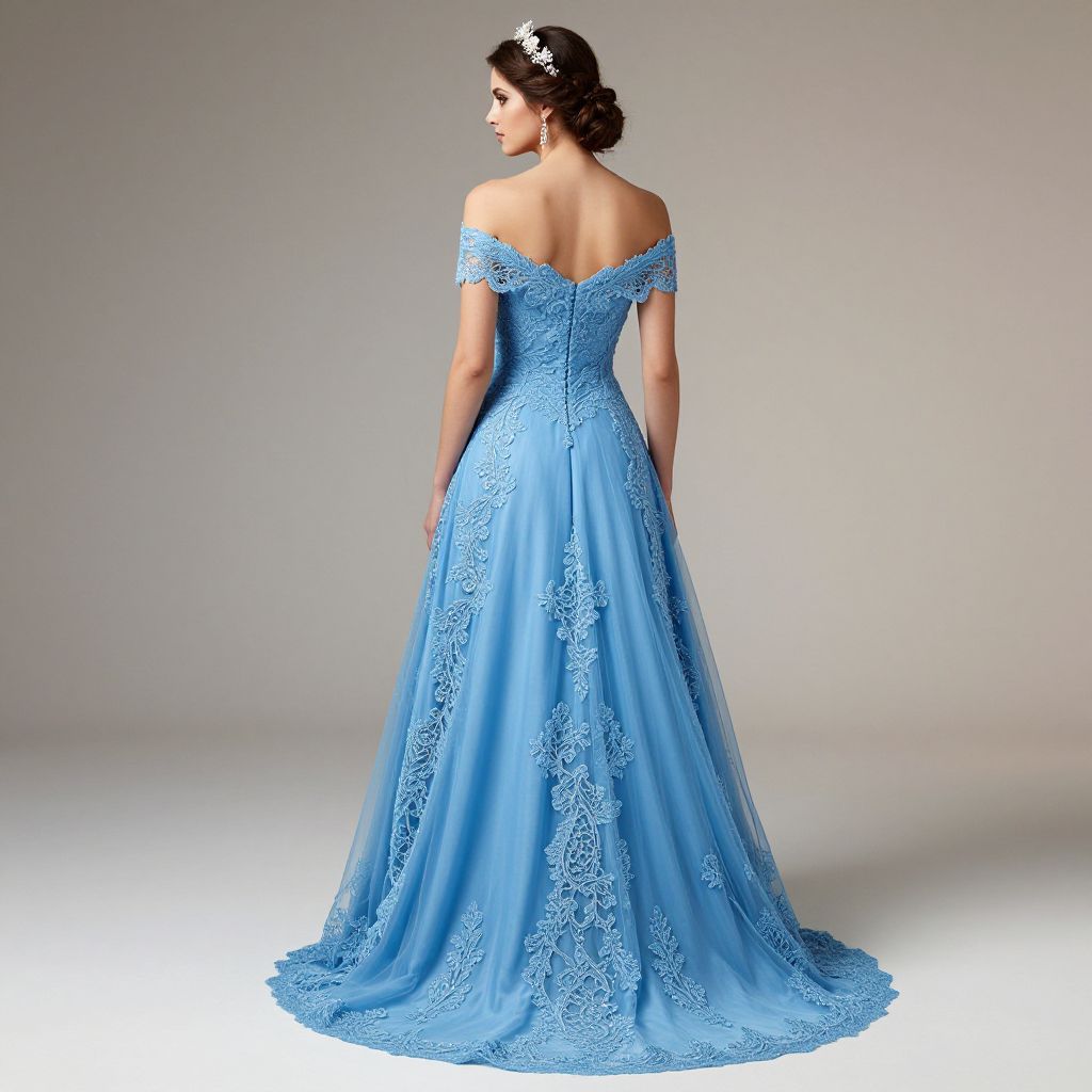 Elegant back view of a woman wearing a stunning off-the-shoulder blue wedding dress featuring intricate Chantilly lace detailing along the sides and hem, complemented by a delicate floral headpiece and dangling earrings, set against a soft gradient background.