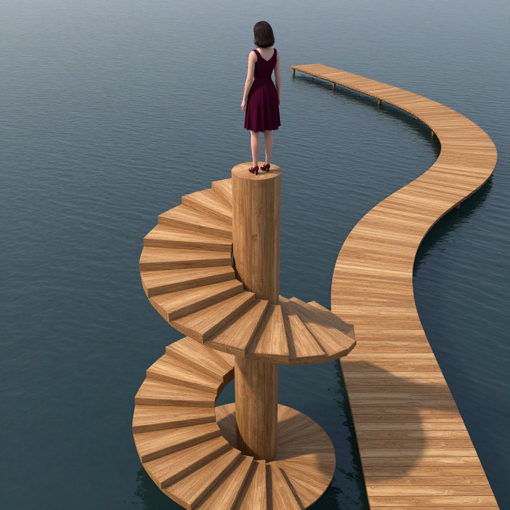 Digital art: Young girl in dark dress stands on wooden spiral pier, overlooking calm blue lake, with wooden pathway curving into distance.