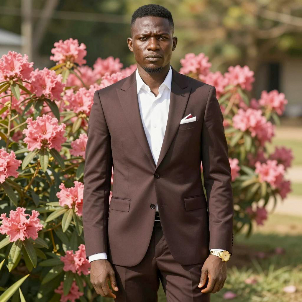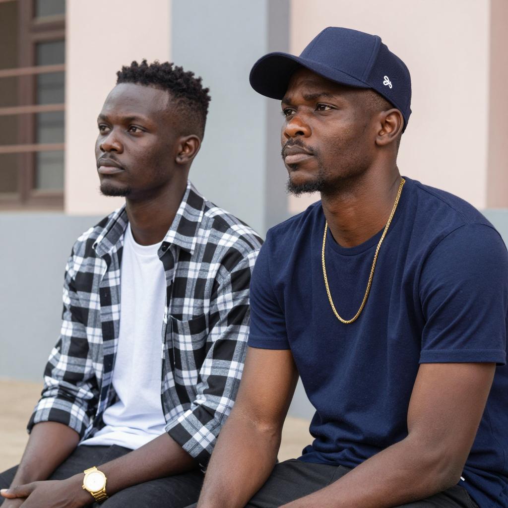Close-up group portrait of four Black men with serious and intense facial expressions against a yellow gradient background. The men are styled with diverse clothing including a brown shirt, white shirt, patterned headscarf, and red headscarf, showcasing a mix of traditional and modern fashion.