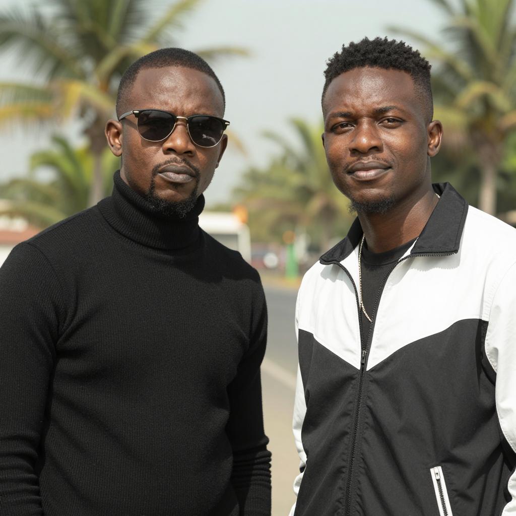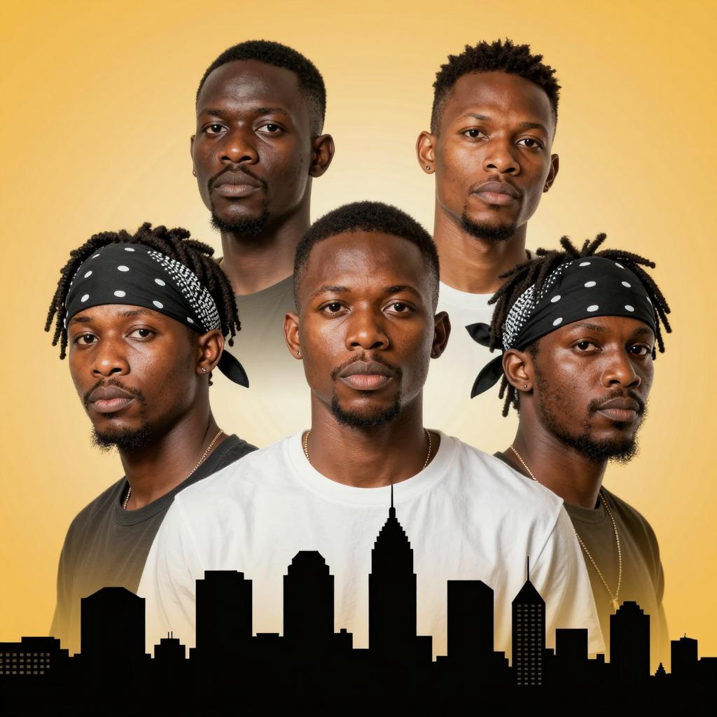 Group photograph of four Black men with intense facial expressions. Foreground: man in brown shirt and bandana, man in white shirt. Background: man with beard and patterned headscarf, man with red headscarf. Yellow gradient background. Close-up, head-and-shoulders shot.