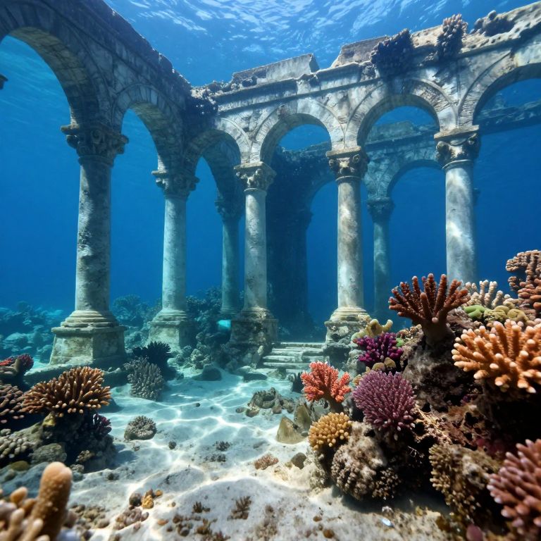 Sunlight filters through the azure depths, illuminating ancient stone columns and arches of a submerged city, where vibrant coral clusters thrive amidst the sandy seabed, creating a rhythmic dance of life and decay.