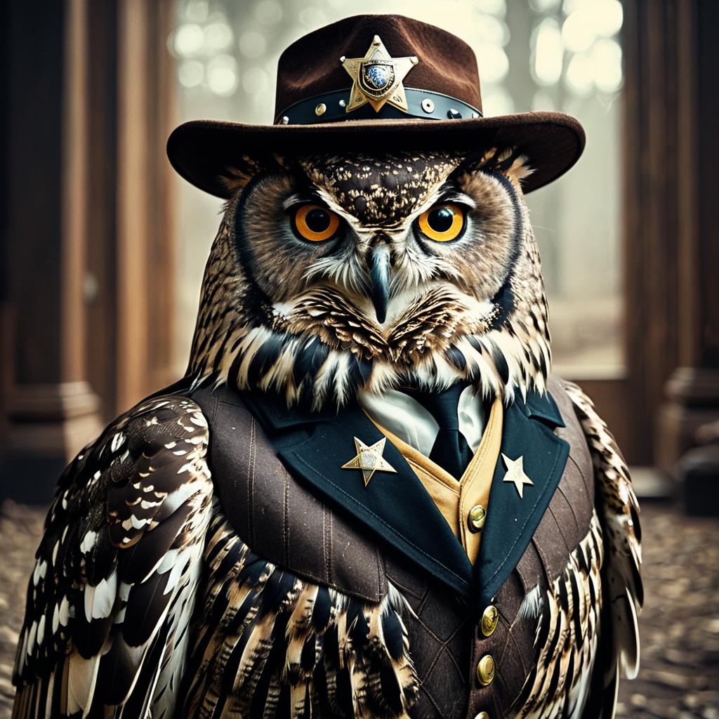 A highly detailed digital painting of a stern-looking owl dressed in judge's robes with a striped tie and a medallion featuring an owl emblem. The owl's intense orange eyes and intricate feather patterns are highlighted against a blurred courtroom background, creating an elegant and authoritative atmosphere.
