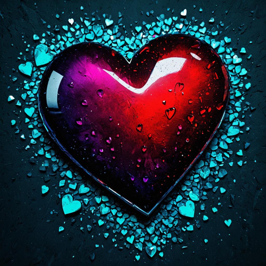Digital painting of a large glossy heart in vibrant jewel tones of red and purple, surrounded by numerous small, bright turquoise heart fragments on a dark background. The artwork evokes deep and intense emotions related to heartbreak with a velvety texture and high-quality digital illustration style.