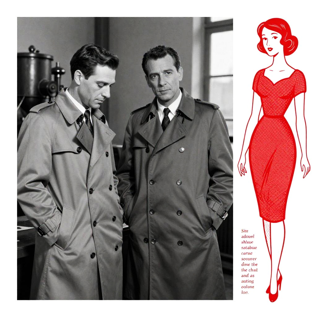 Black-and-white photograph of two men in trench coats, standing indoors, one looking down while the other looks at him. Background includes industrial equipment and a window. Both men have short dark hair. Right side features a red illustration of a woman in a dress. Text and additional graphics surround the main image.
