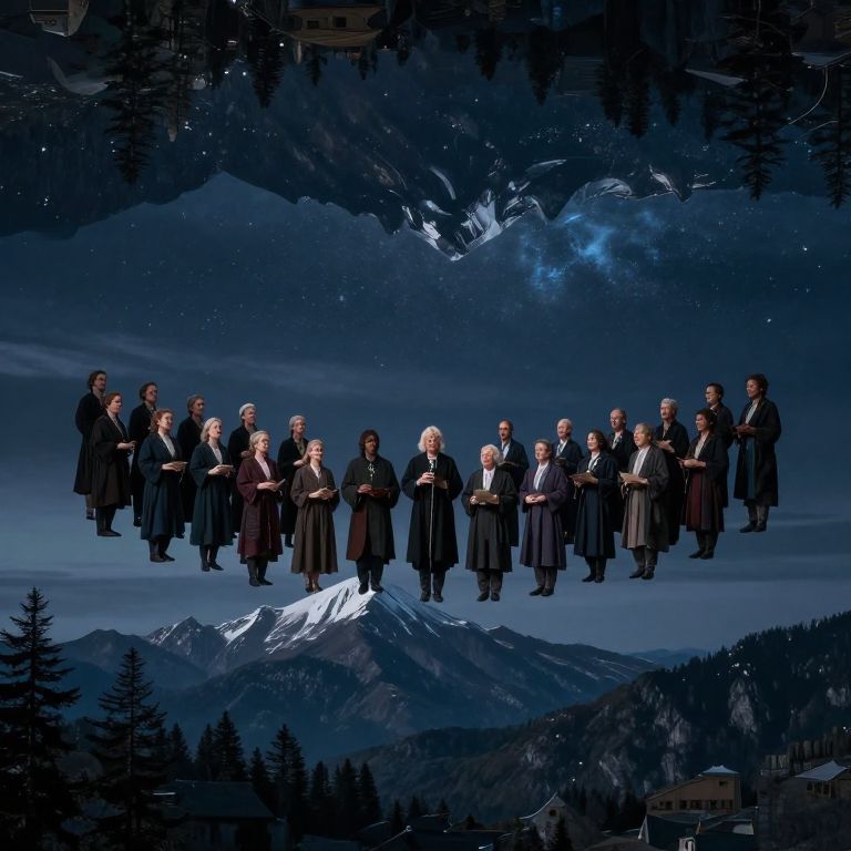 Photograph-like digital artwork depicting a group of 22 men and women standing in a semi-circle against a nighttime mountain landscape. The group, dressed in dark formal attire with long black coats and white shirts, stands on a cloud above snow-capped peaks and pine trees. The sky is deep blue with stars and a glowing mountain range in the background. The individuals, mostly middle-aged with varied skin tones, hold musical instruments, suggesting they are a choir or orchestra. The image has a mystical, ethereal quality, with the figures floating serenely above the mountains.