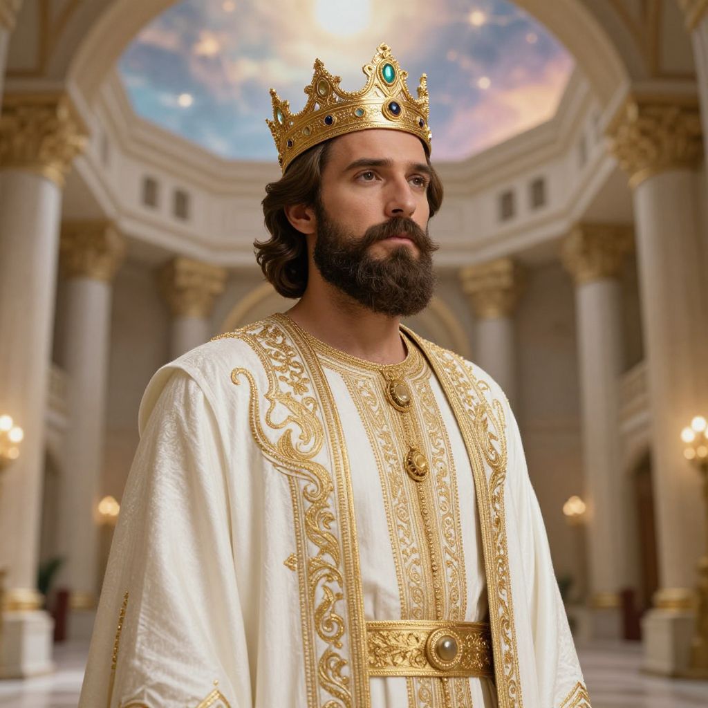 A dignified man with a well-groomed mustache and a full, neatly trimmed beard stands in a majestic, ancient hall illuminated by soft golden light. He wears a magnificent gold crown adorned with intricate gemstones, and a flowing white robe embroidered with elaborate golden patterns that shimmer with every movement. His eyes are calm and wise, suggesting deep knowledge and authority. The background features a grand architectural setting with stone columns and a celestial sky above, evoking a sense of power, divinity, and timeless wisdom.