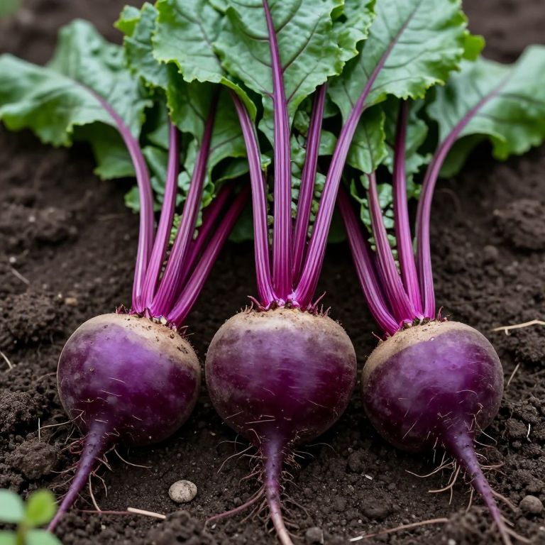 Vibrant beet roots freshly harvested, showcasing deep purple bulbs with lush green leafy tops, resting on dark soil, ready for a bountiful and flavorful harvest.