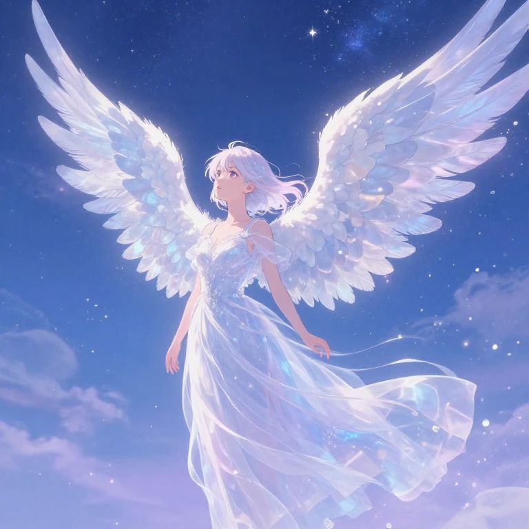 Anime angel wings with translucent feathers blending into a starlit sky, character radiating peaceful aura, surrounded by ethereal particles and gentle breeze, soft pastel blues and purples, dreamy fantasy setting, high resolution digital art.
