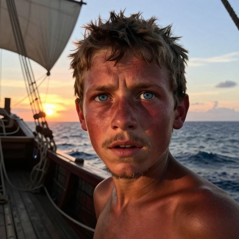 A smartphone camera captures a photorealistic portrait of an excited boy with sunburnt skin, vivid blue eyes, and a hint of a graying beard. His intense gaze is fixed on the horizon as he navigates treacherous waters aboard an ancient ship. The setting sun, dramatic and low in the sky, casts long shadows across his rugged face, accentuating the deep crevasses and resilient lines etched by years spent at sea. Framed within a tight crop, the focus remains solely on his weather-beaten visage, with just a hint of the vast ocean stretching out behind him. This evokes an emotional response of solitude, resilience, and unwavering determination.