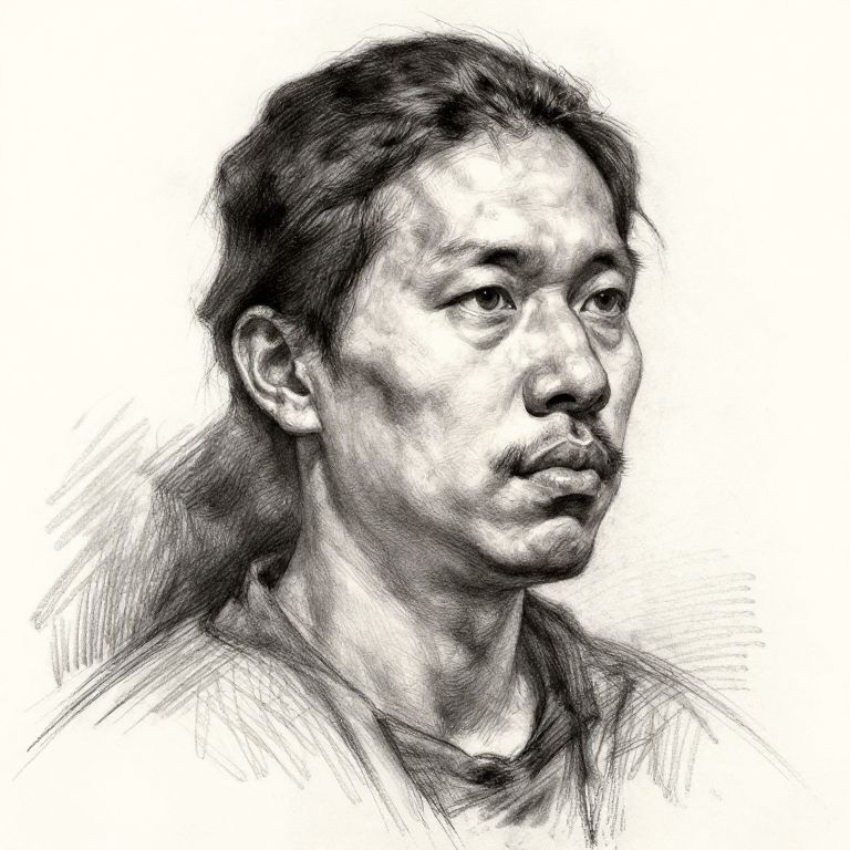 Black-and-white digital sketch of an Asian man with medium-length hair, slight mustache, and serious expression, wearing a simple shirt.