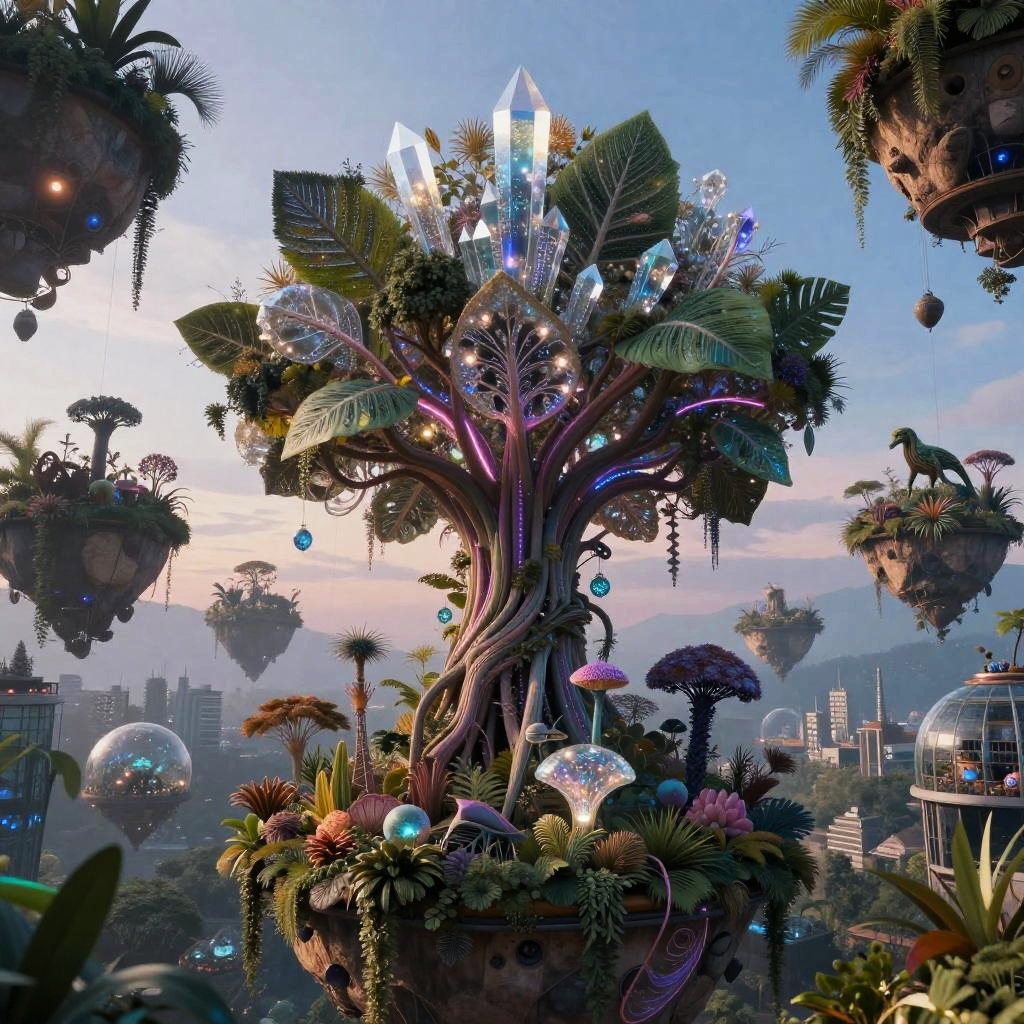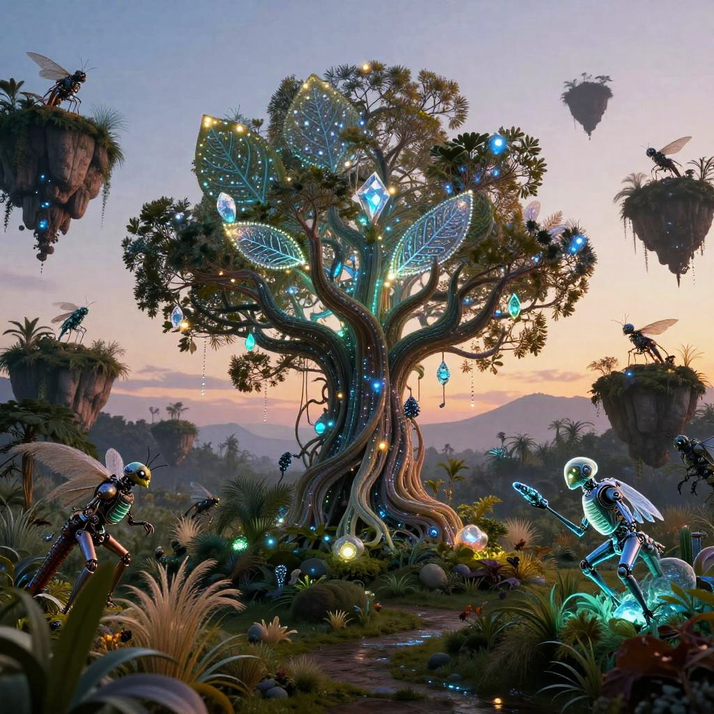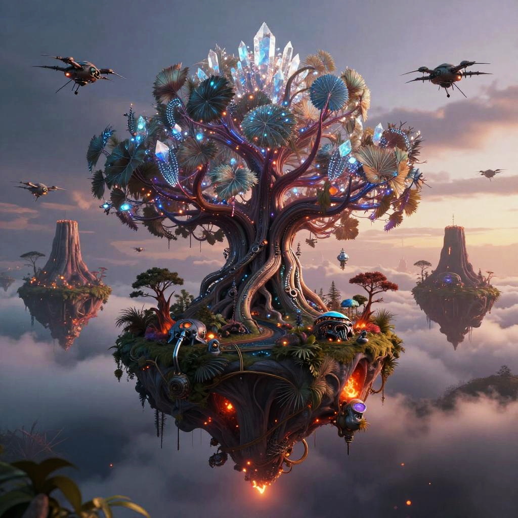A suspended crystalline tundra beneath auroral skies where the essence of bioluminescent mycelial networks coalesces with advanced technology: a colossal tree adorned with shimmering crystal and neon filaments, its leaves glowing softly with intricate patterns, surrounded by floating islands suspended in a twilight sky. Each island hosts an ecosystem that seamlessly merges organic life and mechanical creatures, creating a scene that evokes a sense of mystical wonder and the infinite possibilities of fusion between the organic and the synthetic.