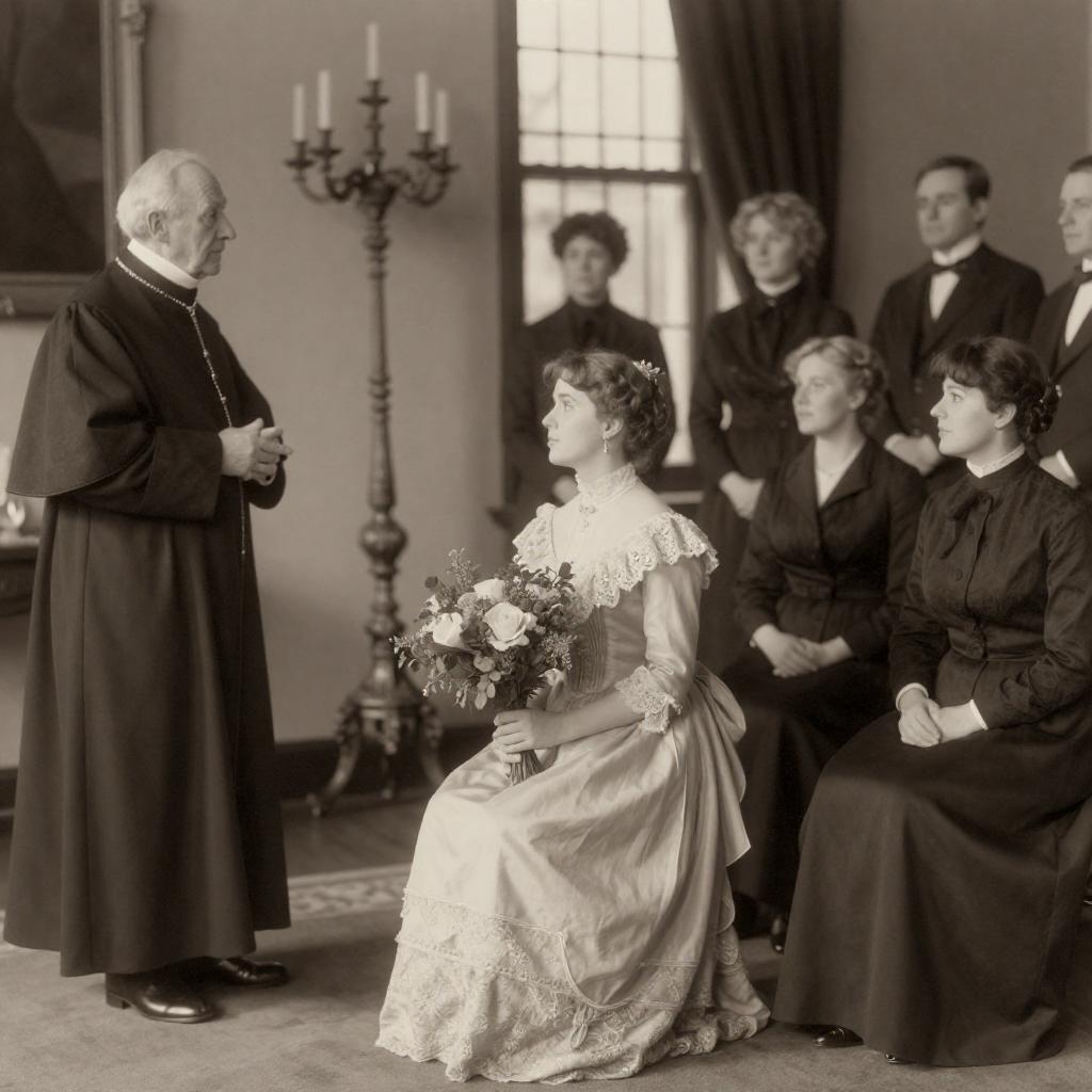 Sepia photograph of a Victorian-era indoor scene. Elderly man in cleric's robes stands on left, gesturing. Young woman in elaborate lace dress kneels center, holding a bouquet. Group of women and men in dark, formal attire sit and stand to the right. Ornate candelabrum and window with iron bars in background. Dim lighting, formal atmosphere.