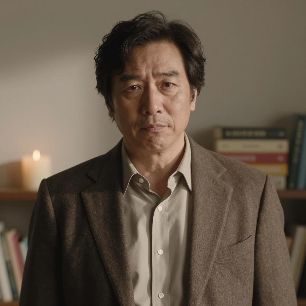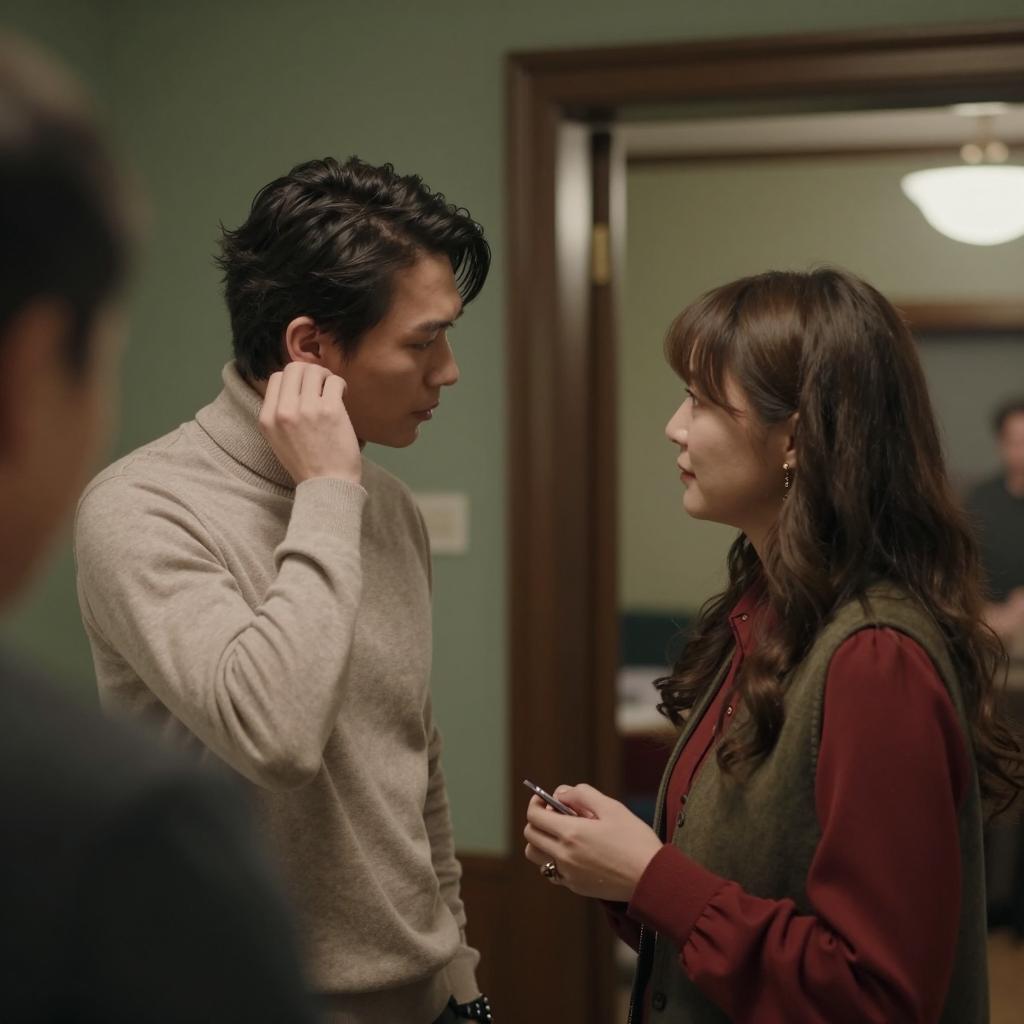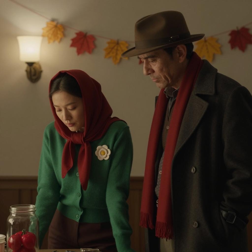 Two people in a dimly lit room. Woman in green sweater, white flower brooch, red headscarf, leaning forward. Man in brown hat, dark coat, red scarf, standing beside her. Glass jar with red object on left. "Autumn" banner above. Light from wall sconce. Both looking downward.