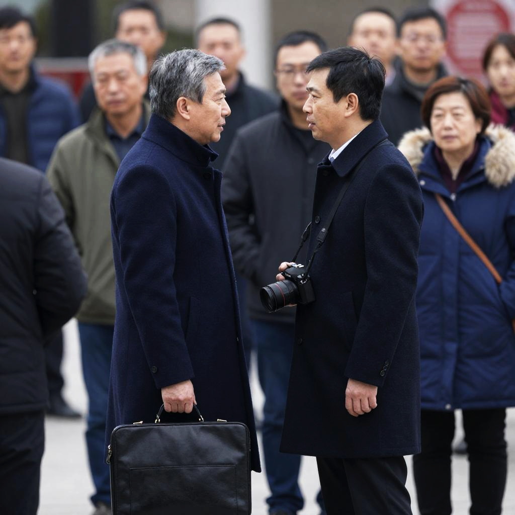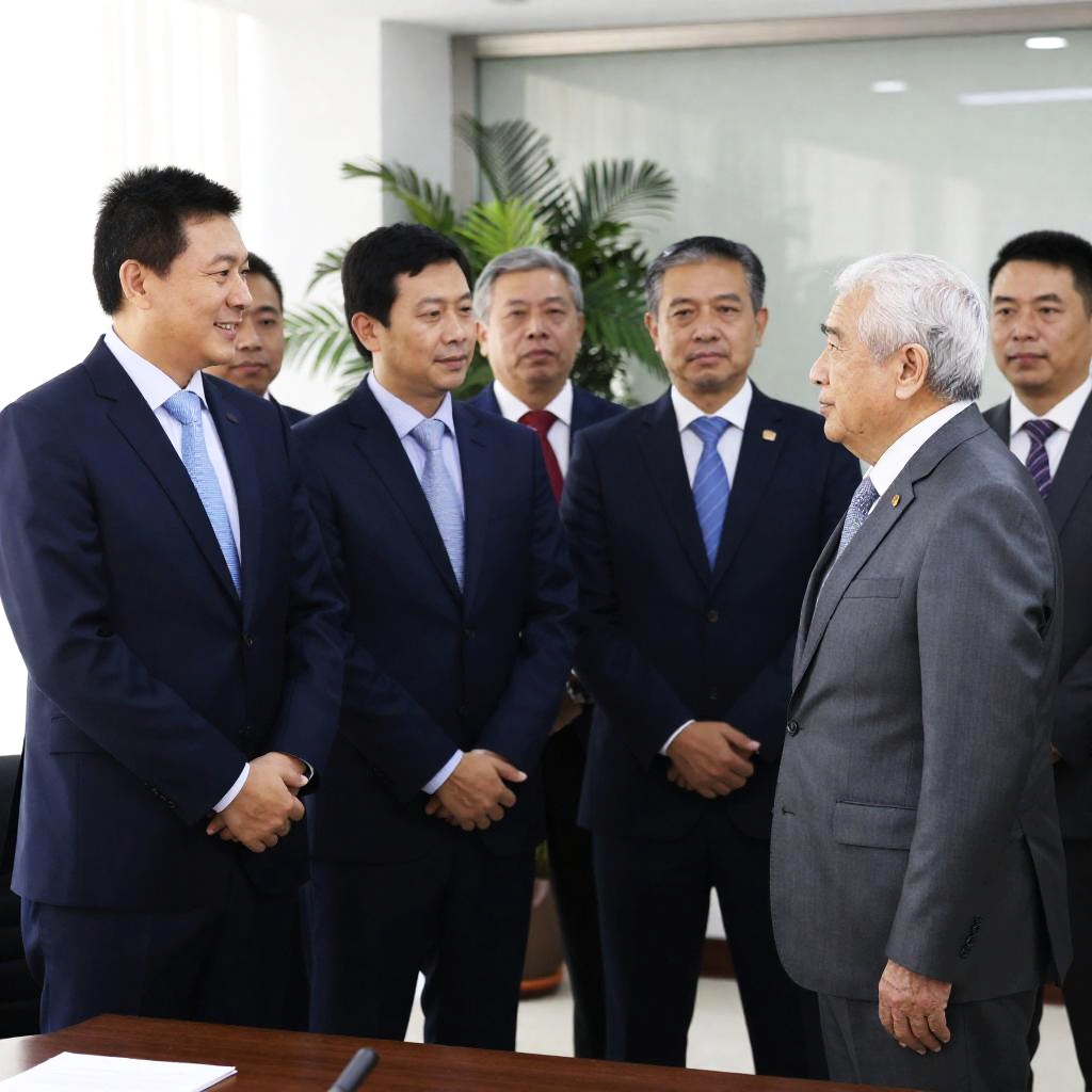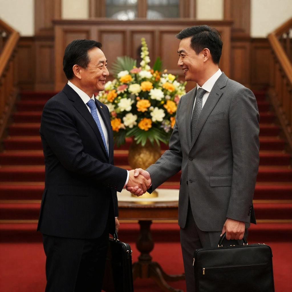 Photograph of two men in suits, one in dark pinstripe, the other in gray, shaking hands in a grand, wood-paneled hall. Red carpeted staircase in background, large floral arrangement on table, black briefcases in hands, both smiling.
