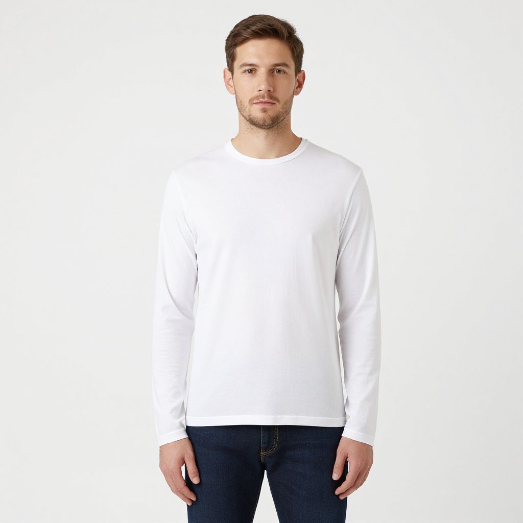 Photograph of a Caucasian man with short brown hair and a trimmed beard standing against a plain white background. He is wearing a plain white long-sleeve shirt and dark blue jeans. His expression is neutral, with a slight furrow in his brows. His arms rest naturally at his sides. The image has a clean, minimalist style with sharp focus and even lighting, highlighting the simplicity of his attire and the stark contrast between the white shirt and the dark jeans.